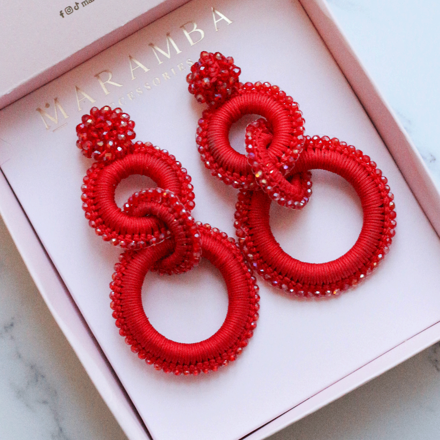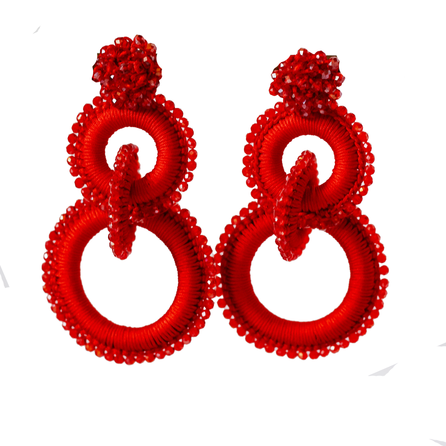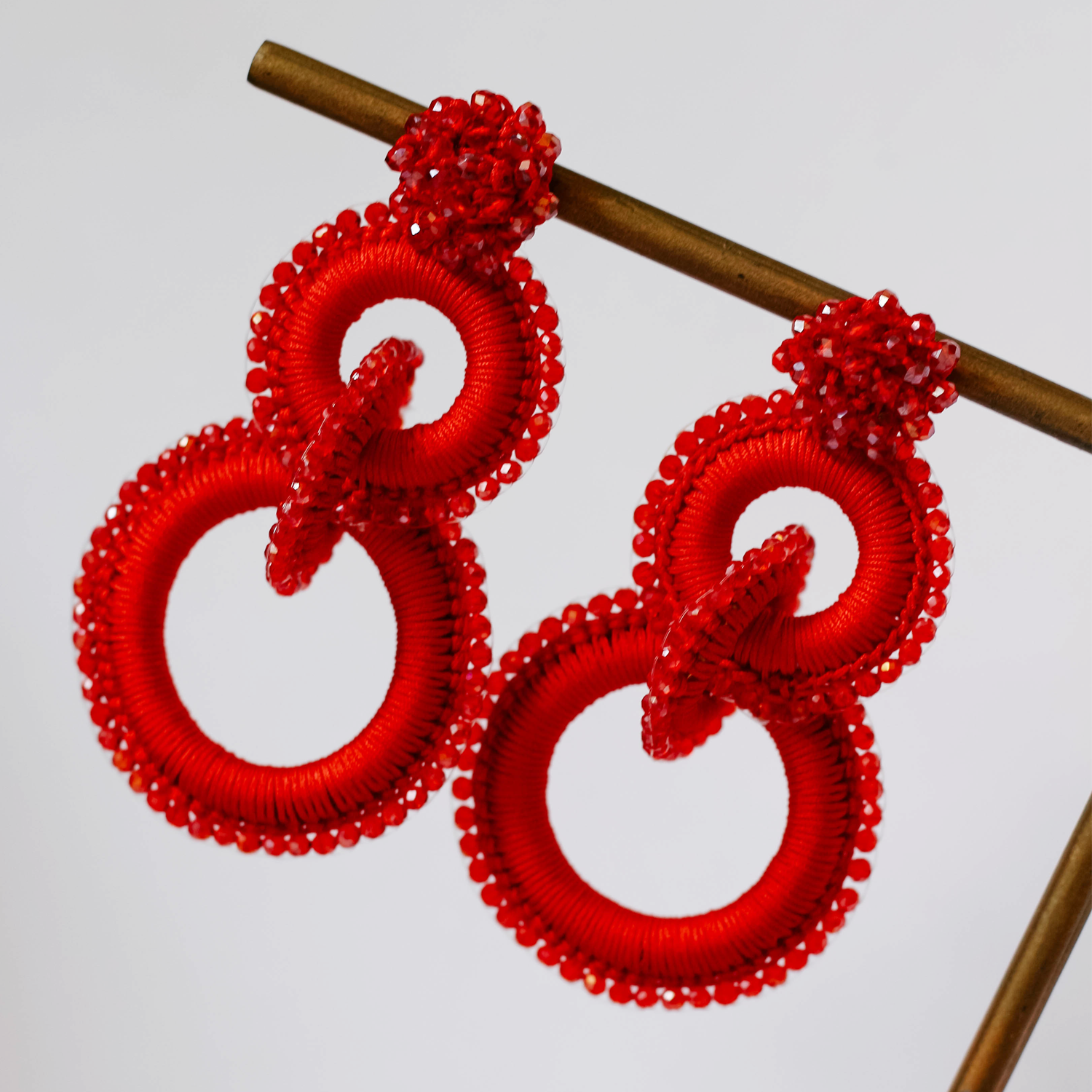 Pendientes Constance hechos a mano en hilos de colores bordados, cuentas y muranos de color rojo