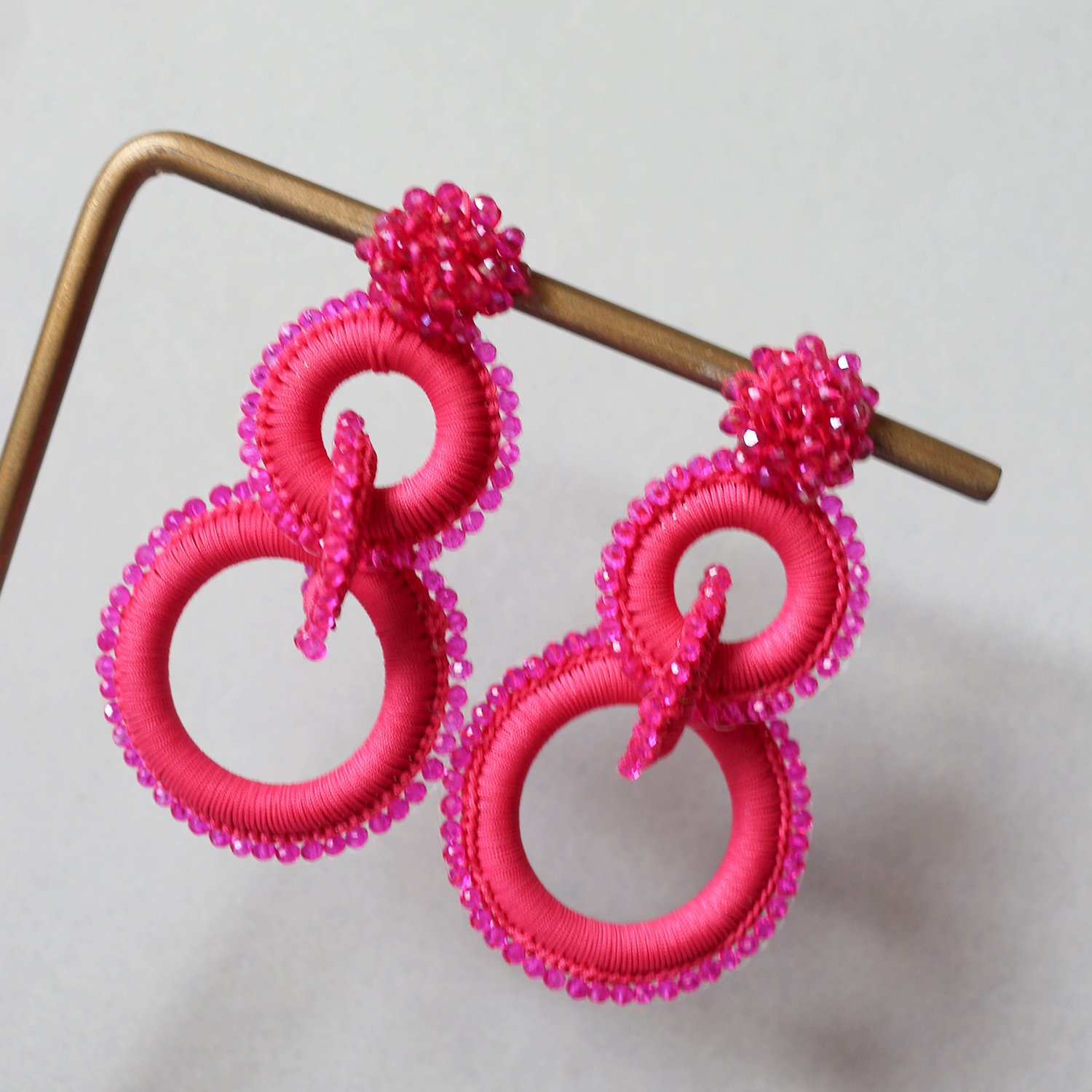 Pendientes elaborados en hilo de color fucsia , cuentas y muranos.