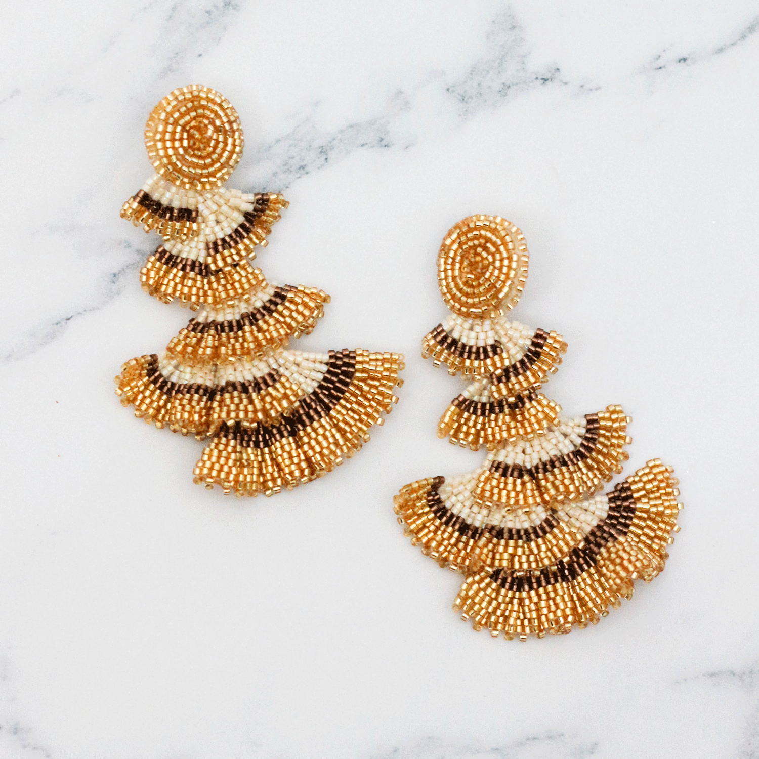 Los pendientes Folk Dorados son una especial mezcla entre un trabajo especial de mijuky con cuentas en color dorado, beige y café.